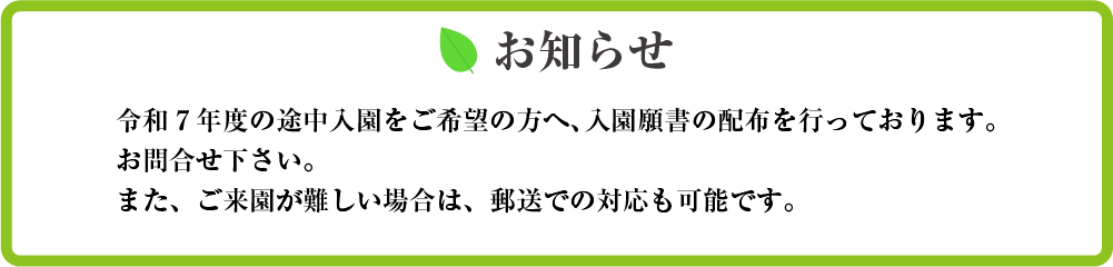 ○ 在園児又は卒園児の弟妹・保護者が卒園児のお子様・盤渓在住のお子様は優先入園となります。